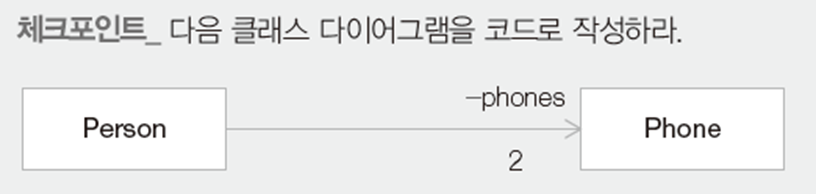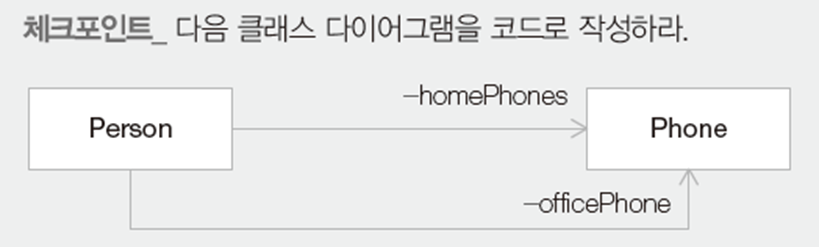 public class Main {public static void main(String[] args) {Person person = new Person("홍길동");Phone phone1 = new Phone("010-1234-5678");Phone phone2 = new Phone("02-123-1234");Phone phone3 = new Phone("010-2345-6789");person.addPhone(phone1);person.addPhone(phone2);person.addPhone(phone3);}}